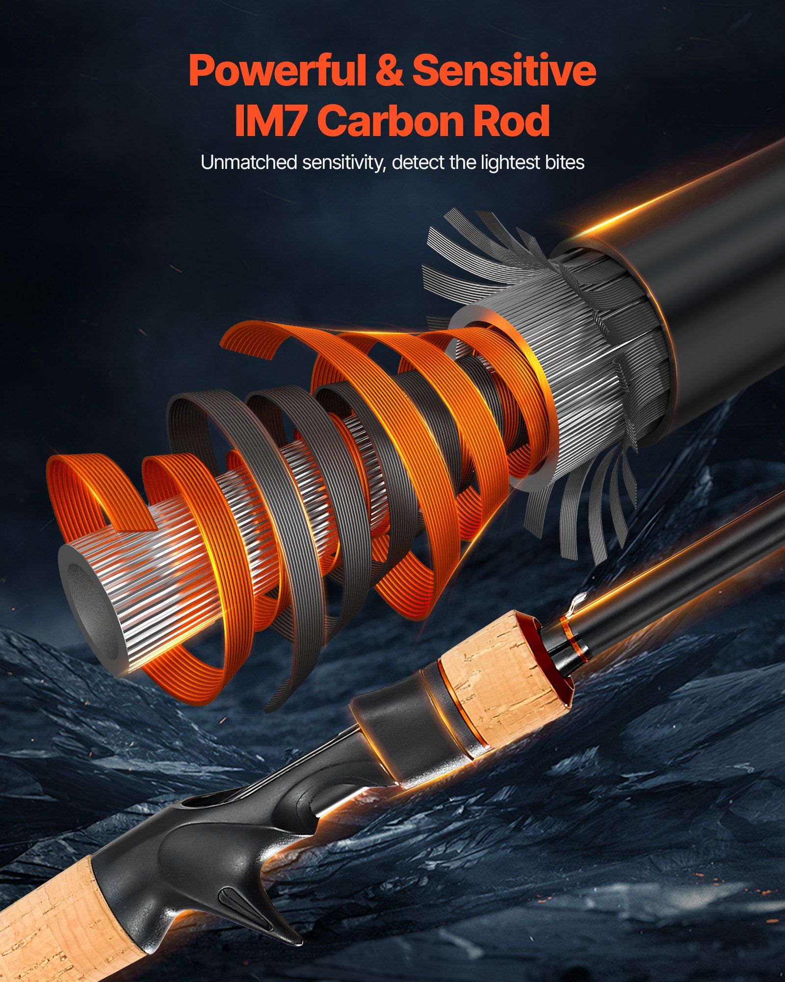 Our rod and fishing reel combo features a 2-piece IM7 carbon rod, lightweight and suitable for various fishing scenarios. Paired with a precision casting reel for smooth operation, the cork handle ensures comfort, and the reel's 7+1 ball bearings and 7.0:1 gear ratio guarantee smooth retrieval.